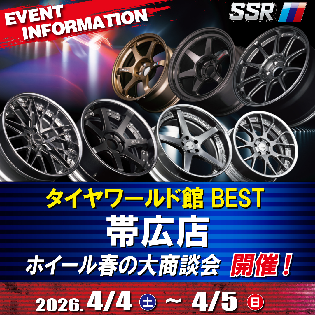 3月28日(土)〜29日(日)の2日間、タイヤワールド館BEST 帯広店様にて 「ホイール春の大商談会」が開催されます。 SSRの2026年度新作ホイールが勢揃い! 新作だけでなく人気のアイテムを多数展示しています。 気になるアイテムを間近で見るチャンス! 春の履き替えシーズンに向けて、検討してみてはいかがでしょうか? 皆様のご来店をお待ちしております。 店舗情報 タイヤワールド館BEST 帯広店 住所:北海道帯広市大通南17丁目1番地 TEL:0155-66-5357