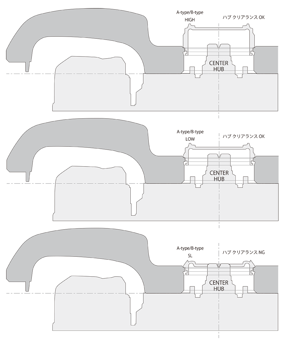 干渉を防ぐため、高さのあるHIGHタイプやLOWタイプのセンターキャップを選ぶ必要があります。