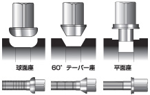 ホイールの車体への装着 取り付けナット・ボルトの選定 ホイールの取付けナット座(ボルト座)には、60度テーパー座、球面座、平面座などがあります。それぞれの形状に合ったナット(ボルト)をご使用ください。車両のハブボルト(ボルト穴)と、取付けようとするナット(ボルト)の径、ネジピッチ、および長さが合っていることを必ず確認してください。 取付けナット(ボルト)は、必ずホイール指定の物を使用してください。 指定外の部品を使用して、十分な締付けができないと、走行中にホイールが外れる危険があります。