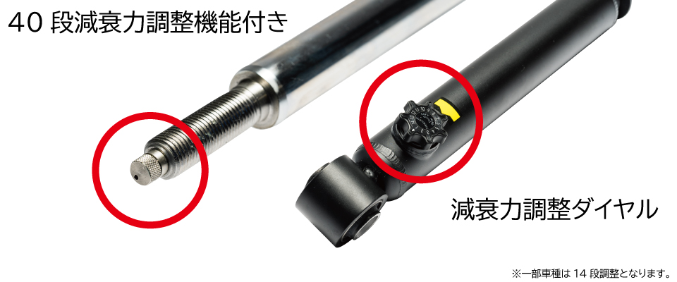 純正ショックアブソーバよりも伸び側のストローク量を増加させることで乗り心地の良さを確保し、同時に、軽自動車などでたまに起こる「伸び切り」も改善。さらに、自分好みの乗り心地を具現化できる「40段減衰力調整機能」を標準装備(※一部車種は14段調整)。超ワイドレンジの調整幅で理想通りのセッティングへと導きます。