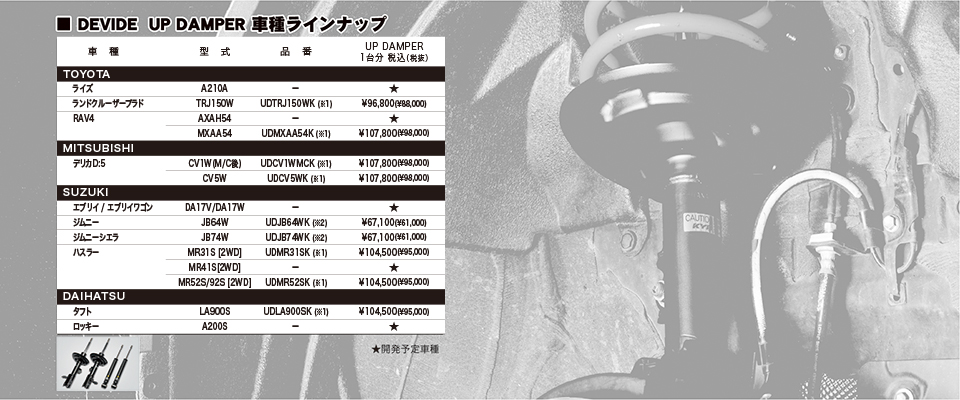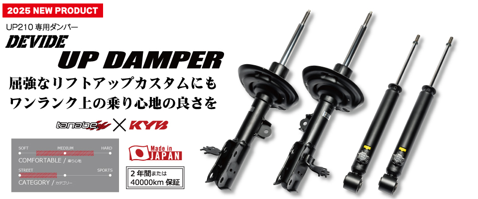 純正と交換するだけで、迫力のあるリフトアップスタイルを実現するDEVIDE UP210スプリング。冷間成形スプリングならではの乗り心地の良さはそのままに、さらなる走破性と快適性を高次元で融合させる「DEVIDE UP DAMPER」は、ワンランク上の快適な乗り心地を求めるためにタナベとカヤバが共同開発したUP210専用のショックアブソーバです。