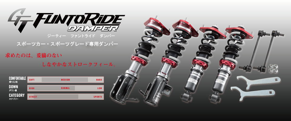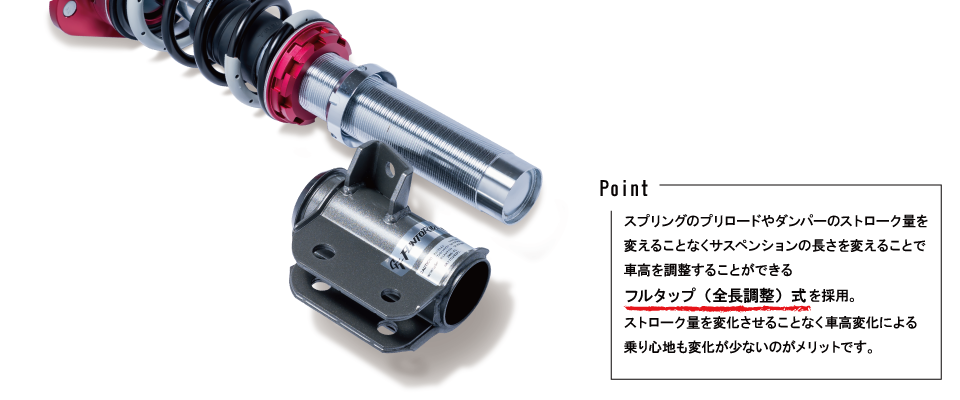 多彩なアジャスト機構によって、ハンドリングやライド感を自在にコントロール可能な全長調整式車高調。