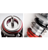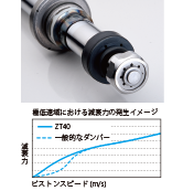 フロントアッパーマウントは上へオフセットさせることによりストローク確保でき、不自然な突き上げがなくなり、自然なドライビングが可能となりました。